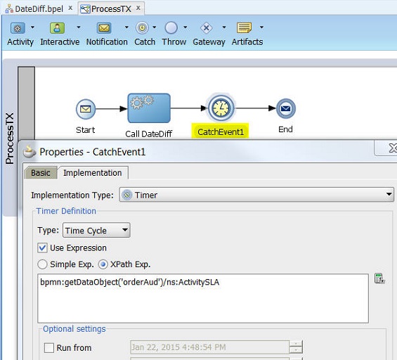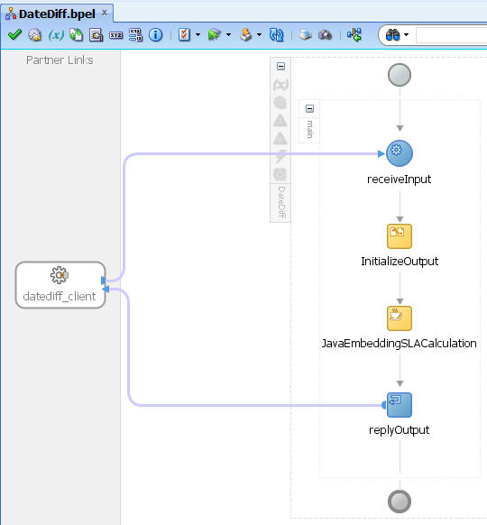 Create a client (a BPM process in this example) to use this utility. Below, the ‘Call DateDiff’ makes a service call to the BPEL process with the two dates as input variables and gets back a SLA value to be used in the BPM process. The Catch Timer Event ‘CatchEvent1’ uses this SLA value.