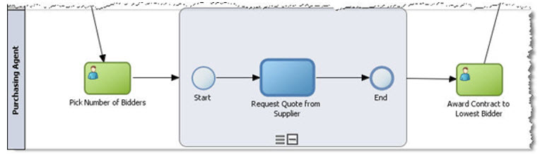 Processes often need feedback from the instances spawned by the Multi-Instance Subprocess activity. In this example, a purchasing agent decides at runtime how many suppliers will be allowed to bid. This number is used in the Multi-Instance Subprocess activity to spawn that number of instances in the synchronous Request Quote from Supplier subprocess call activity. As each supplier bids in the child subprocess, the bid information is carried back into the Multi-Instance Subprocess activity.