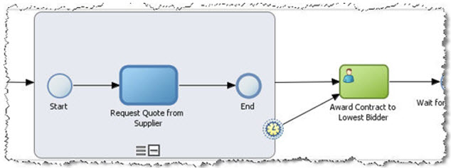 - If not all the suppliers have placed their bids, the Timer Catch event (note the clock on the right edge of the Multi-Instance Subprocess activity) times out after the designated time interval.
