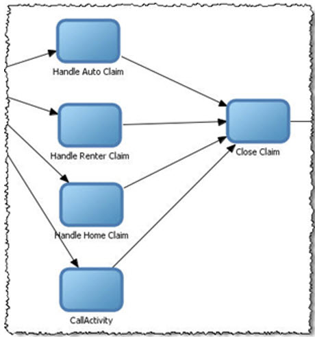 As shown below, there can be many sequence flows representing many different business rules leaving a single Exclusive Gateway. In this insurance claim process, the Exclusive Choice pattern indicates a single insurance claim cannot be both an “Auto” and a “Renter” insurance claim. Instead it means that the claim can be either an “Auto” or “Renter” or “Home” or “Life” insurance claim. The instance leaving the Exclusive Gateway goes through only one of the sequence flows.