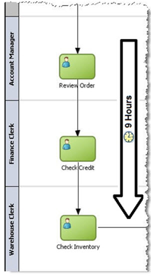 Individual activities can sometimes create bottlenecks in a process. This can cause a problem in a process if the activity causing the bottleneck cannot be accessed by participants of the process. In this example, the Wait for Supplier OK catch event has no human interaction and is waiting for an external notification that might never come.