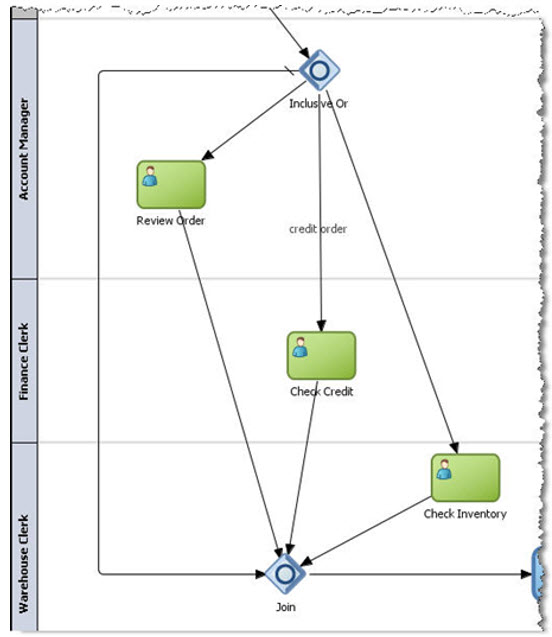 In the above example the middle sequence flow going to the Check Credit activity was changed to a conditional sequence flow. Now the instance will flow to the Check Credit activity during runtime only if the order is a credit order. Because the other two sequence flows going to Review Order and Check Inventory must always be taken the logic in the conditional sequence flows going to these activities needs to be set to true.