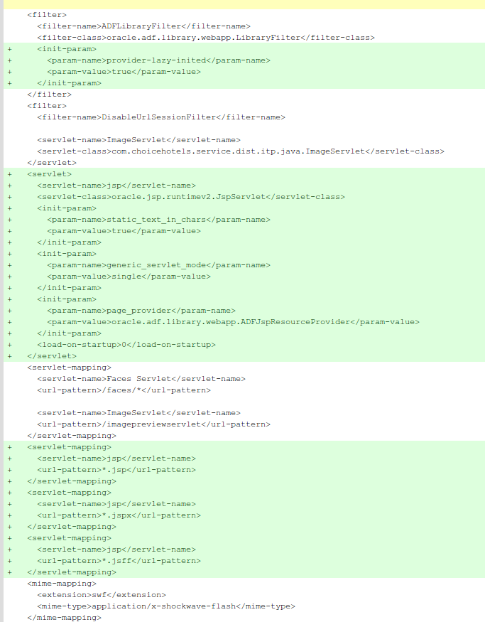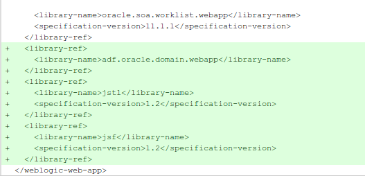 Now that our WAR builds properly, there is one more step. That is to compare the Maven produced WAR file to the JDeveloper produced WAR file. This will help you confirm that you setup your dependencies and build configuration correctly but also help you find other changes JDeveloper may make at packaging time. I found that both the web.xml and weblogic.xml had additional items added at packaging time. There was no reason these sections should not have been in the web.xml and weblogic.xml at development time, so we took files from the the JDeveloper produced WAR and copied them back into our project to replace the existing ones. These updated files will then be used by the maven build as well. Below are the diff’s of our web.xml and weblogic.xml.