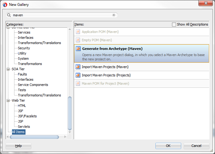 The Oracle document mentioned at the beginning of this article explains in detail what each one of the options means and how to tweak them. Alternatively, if you are not much of a fan of creating an application from the command window, you can create your application using the JDeveloper user interface because your local m2 repository contains the Oracle archetypes. To create the app from JDeveloper do the following: