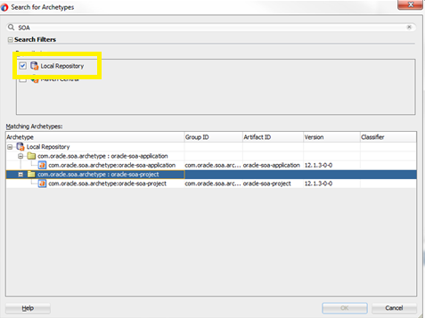 Type SOA in the search box and you should see Oracle’s archetypes available in your local repository. You should see two (SOA-Application and SOA-Project). If your local repository is not set up properly, the local repository option will be grayed out and unavailable: