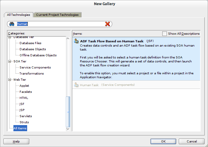 Yesterday, while working on a sample project with a co-working I came across what looks to be a new bug in JDeveloper 11.1.1.6.0 when trying to create a Taskflow based on a Human task.
