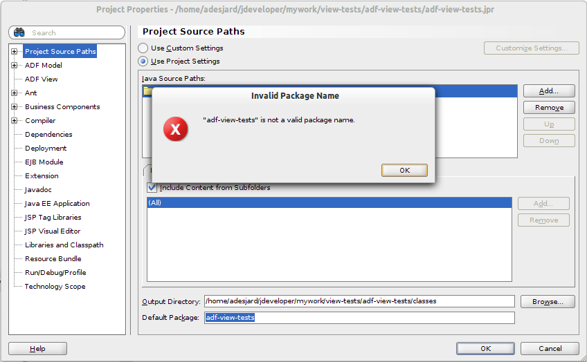 As you can see below when I open the project perferences again and simply try to press OK at the bottom I am notified that the package name is not valid. So not only did it generate the DataControls.dcx file into the wrong package it actually changed the default package for my project to this invalid package name.