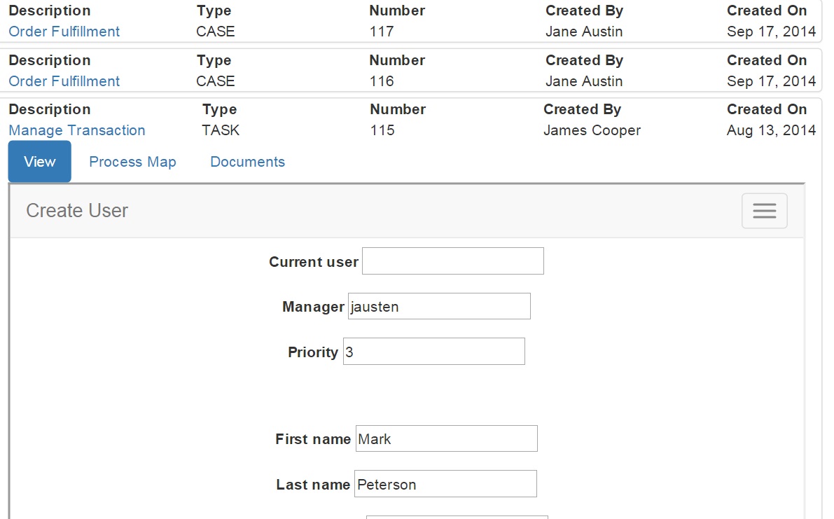 The card can be expanded to show more detail. Here, a task card is expanded showing a tabbed panel appropriate for tasks. For example, the tabs shown for a task are; View, Process Map and Documents. Again, these are fully customizable. But here we show the task form, process maps or documents displayed within the context of the main workspace view.
