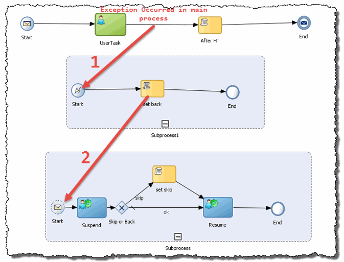 - Do not place event subprocesses with Error Start events in the same process that also has an event subprocesses with a Message Start event. As shown in the anti-pattern below, after an exception occurs (1 below), if a SKIP or BACK is thrown from the Error event subprocess, instead of being returned to the main process the instance is instead incorrectly sent to the event subprocess with the Message Start event (2 below).