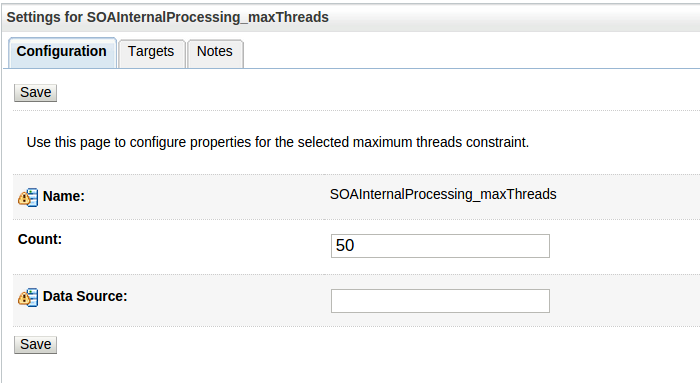 By default the SOADataSource is set to a maximum of 50 connections. Also by default 20% of this is allocated to incoming requests, 50% to internal processing and 30% to internal buffer. As you can see below, this results in the SOAIncomingRequests_maxThreads being set to 10 threads and the SOAInternalProcessing_maxThreads set to 25 threads.