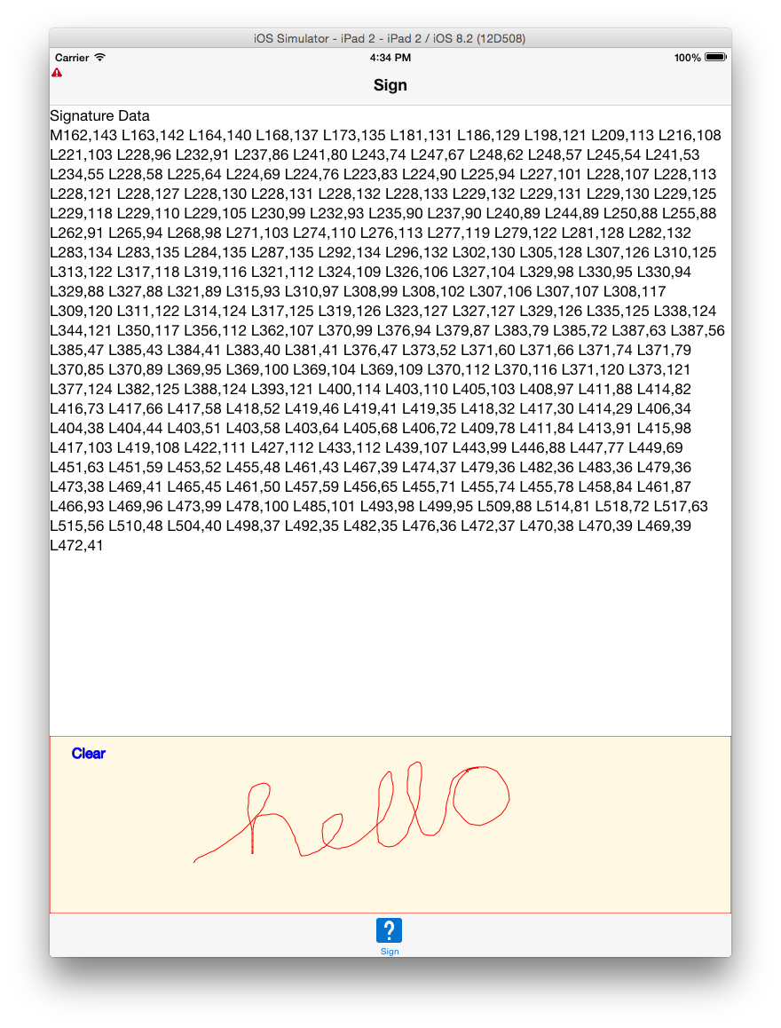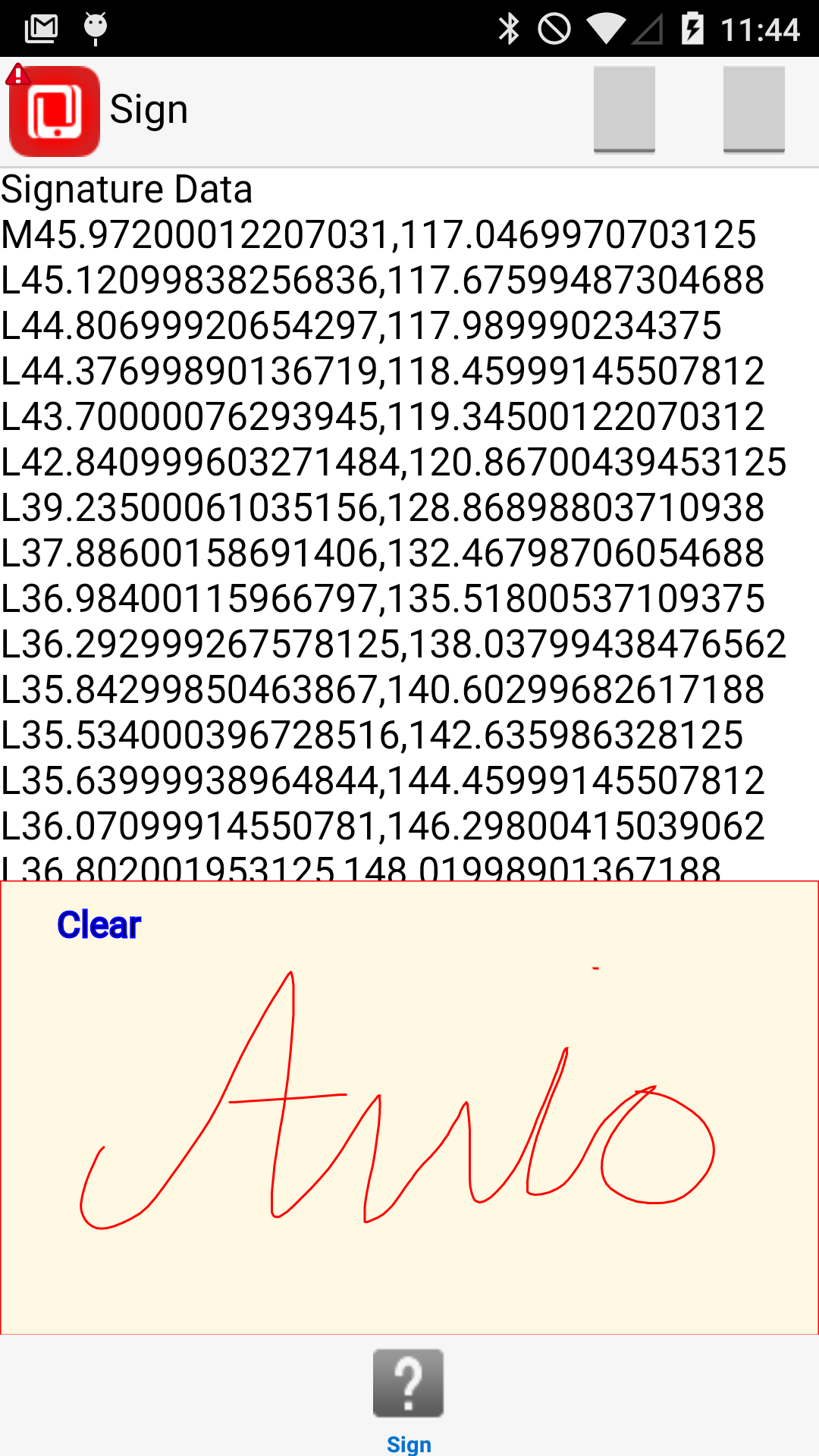 When you run this app, you will see the signature block, with the clear button, and the data at the top of the screen will show what the actual signature data looks like, it is much smaller than the same signature in a bitmap. My penmanship is even worse than my javascript.